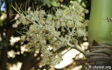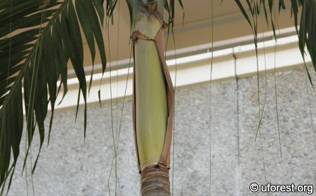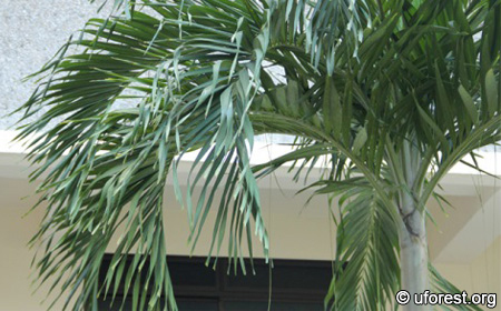 A single stem palm, Adonidia merrilli is a short palm normally up to 5m. It has a clean length of crown shaft and threads of marginal strips can often be seen drooping from the leaf. Two distinguishing features are the floppy ends of the leaflets, and the smoky green colour of the leaves.