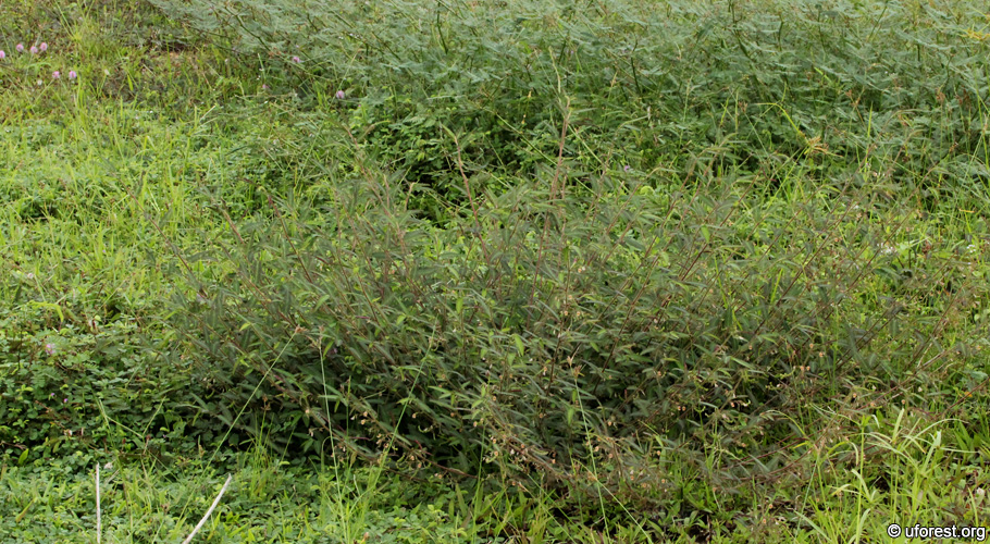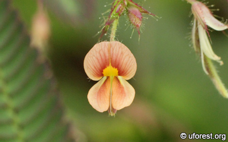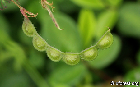 Aeschynomene americana is an erect shrub common in scrublands. The pinnate leaves tapers like a lance. It is easy to identify from the red flowers which come with a yellow centre. The fruit pod have segments that are curved at one end.
