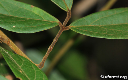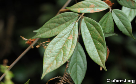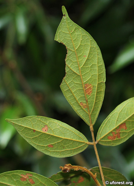 A woody climber in forests, Agelaea borneensis has alternative leaves that are trifoliated. The leaves have prominent secondary and tertiary veins, with brown hairs sometimes covering over the upper veins and leaf stalk.