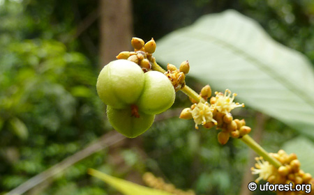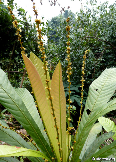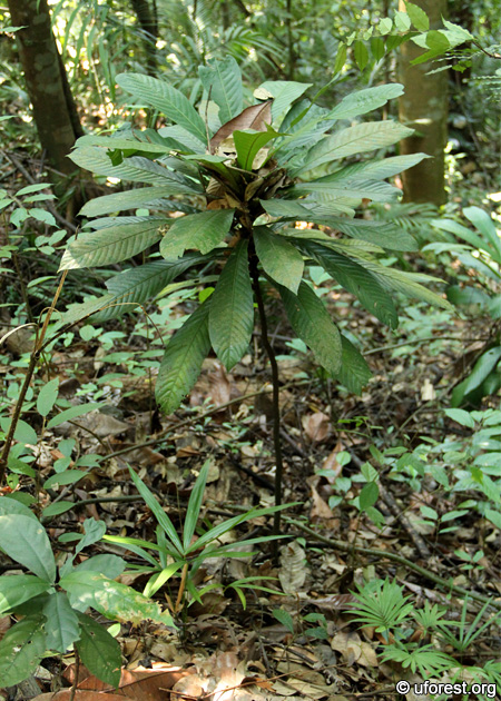 Agrostistachys borneensis is a very common short tree found in the understorey of Bukit Timah and Central Catchment Nature Reserves. The form is very distinct, being short (normally below 3 meters), lacking branches, and with large leaves densely arranged in a rosette near the apex.