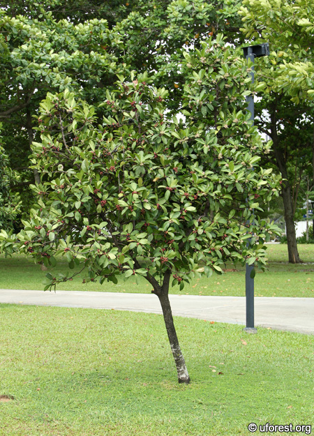 Ardisia elliptica is a small bushy tree sometimes pruned as a shrub. It is recognisable from its fleshy thick leaves which are oppositely arranged, reddish petiole, and inconspicuious veins. The ends of the twigs are swollen. It flowers and fruits very often and gregariously, hence making it an attractive ornamental plant.