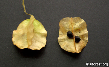 Three winged fruit (left) and the interior, showing the seeds (right)
