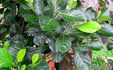 A tree growing up to 15m, Artocarpus heterophyllus is commonly cultivated for its edible fruits and also a common remnant species in our abandoned plantations, It can be identified from its dark shiny green and hairless leaves. The diagnostic fruits are large and bore on the trunks or main branches (Corner, 1997).