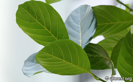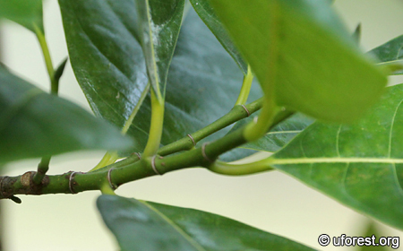 Dark green and shiny leaves with prominent lighter young leaves.