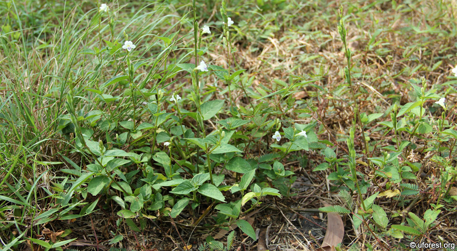 Asystasia gangetica ssp. (subspecies) micrantha is a very common herb found in open and semi-shaded areas. The white flowers with a purple-tinted lip is impossible to miss when it flowers. Vegetatively, the leaves are opposite, finely haired, and the leaf blade runs narrowly along the petiole to the stem.