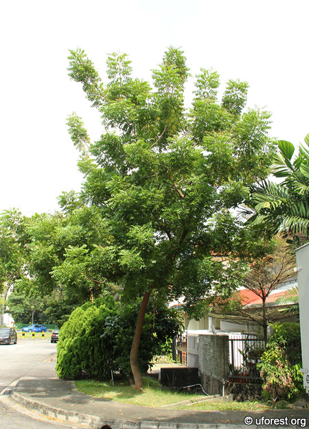 Azadirachta indica, a fairly common cultivated tree, can be easily recognised from its foliage and leaflets. The pinnate leaves spiral around the branches, creating a foxtail-like foliage. Each leaflet is small (about 5cm), sickle-shaped and have serrated margins.