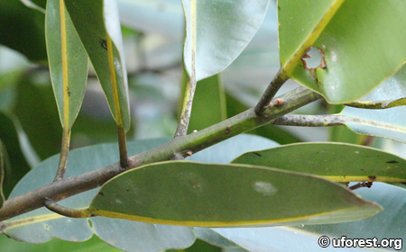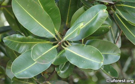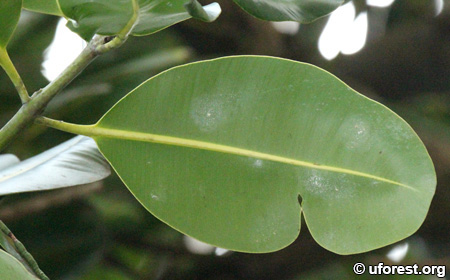 Calophyllum inophyllum is a common seashore and cultivated tree. It has typical Calophyllum leaves, smooth with many indistinct parallel secondary veins. It can be distinguished from other Calophyllum species from its oval-shaped leaves.