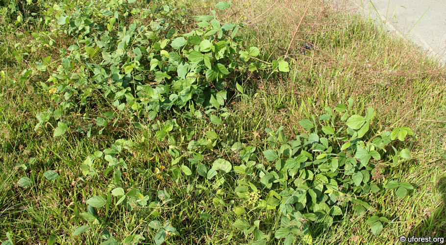 Calopogonium mucunoides creeping over a wasteland in Sengkang.