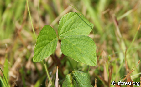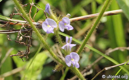 A common creeper in scrublands. The stem and fruits are noticeably hairy. There are a few other common trifoliate scrubland creepers like Centrosema pubescens and Centrosema molle, but Calopogonium mucunoides has broader leaflets and distinct depressed secondary and teritary veins.