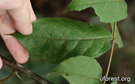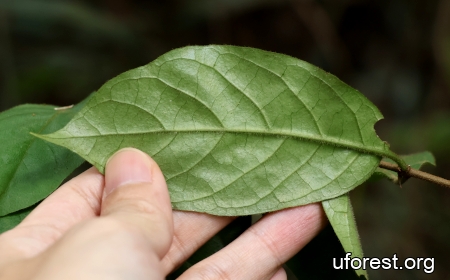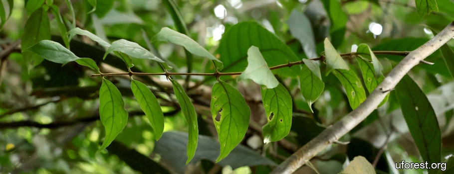 A scrambling vine that climbs with a pair of recruved hooks at the interstipular scar. The leaves are velvety and covered with hairs. This is the only Canthium climber in Singapore.