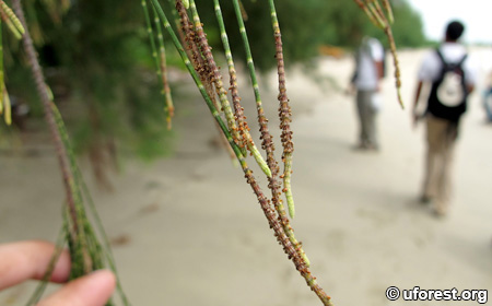 A tall somewhat cone-shaped tree growing up to 50m, Casuarina equisetifolia is a tree that is very common along sandy shores. It has bushy, horse-tailed like foliage, with green-coloured twigs; flaky bark, and cone-like fruits. It is also sparingly cultivated in some areas.