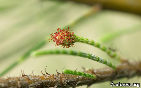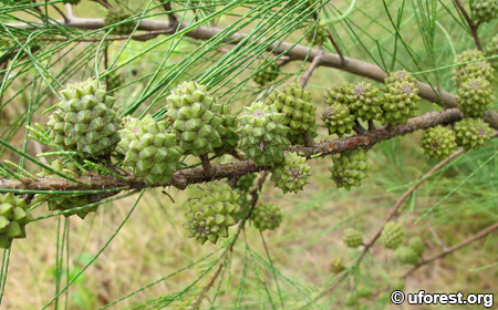 The leaves of the Common Rhu, and other Casuarina species are reduced to small claw-like scales, and the green twigs replaced the function of photosynthesis. It is fast growing, growing about 3m a year under suitable conditions (Corner, 1997). The male flowers are borne on the ends of the green twigs, while female flowers extend from brown branches.