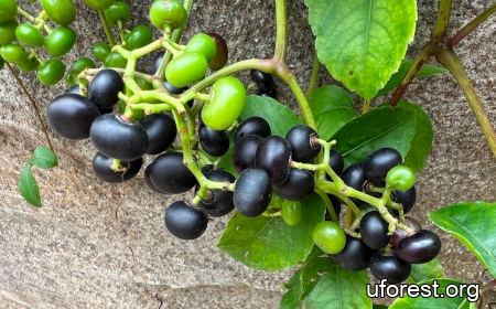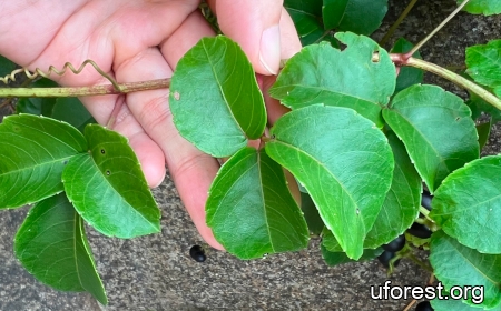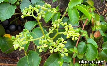A climber commonly found in young secondary forests. It has three leaflets, each with serrated margins. The fruits grow in clusters like grapes and ripen to dark purple.