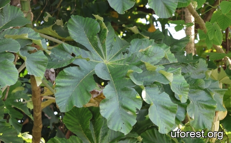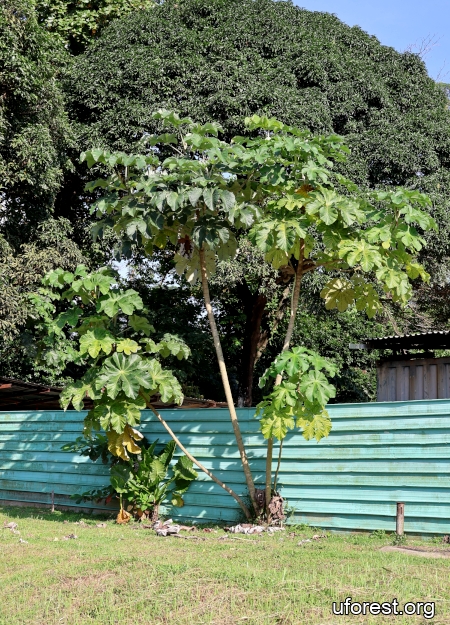 A naturalised tree found mainly in the northern and western forest fringes in Singapore. The stem has obvious segments. The large leaves are deeply lobed and often with wavy margins. It can be differentiated from a less common congener, Cecropia peltata for the presence of brown indumentum at the base of the petiole.