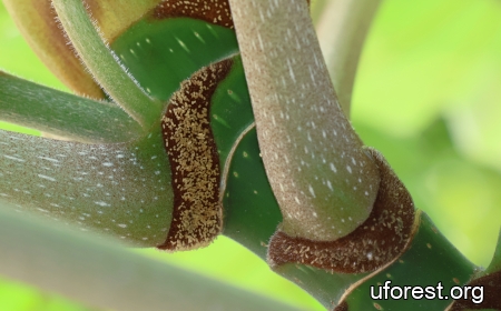 Brown indumentum with white Müllerian bodies at the base of the petioles.