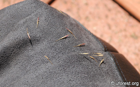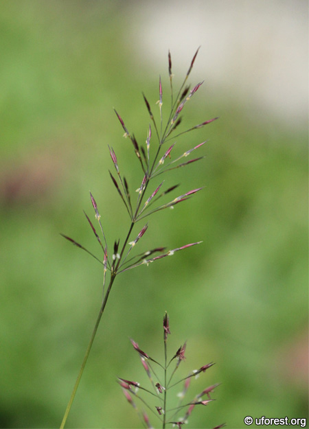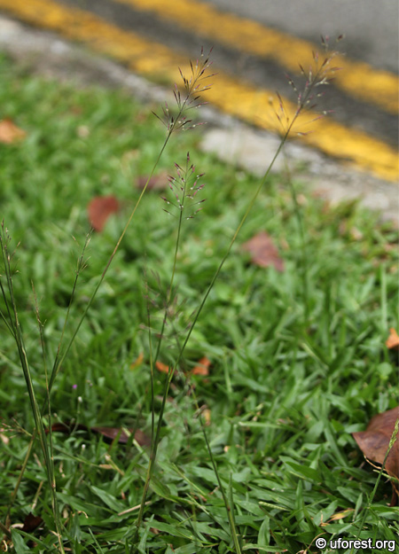 A very common weed in lawns, Chrysopogon aciculatus can only be easily spotted and identified when it flowers. The inflorescence stalk is well exserted, and branches in several whorls, each ending with a red or purple spiklet.