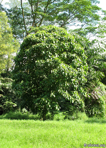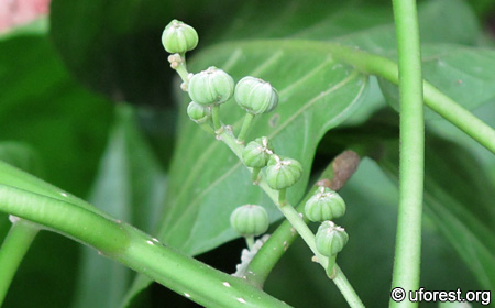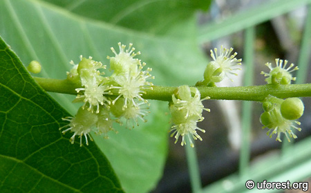 Claoxylon indicum is a sun-loving tree commonly found along secondary forest edges or open areas. Its spirally arranged leaves are thin, large, soft and velvety; and comes with a long stalk. During flowering, spikes of flowers can be seen protruding out from the foliage (unfortunately my photo is not clear enough). However, a gentle touch of the leaves to feel its various characteristics is suffice for identification.