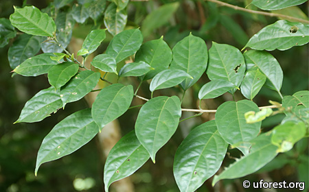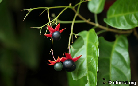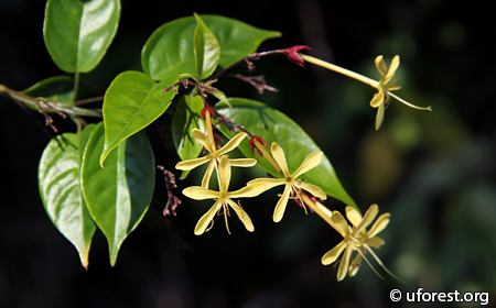 Clerodendrum disparifolium is a shrub or small tree that is common around open areas in secondary forests. The leaves are oppositely arranged, glossy, with crenate margins, and grooved petioles. The flowers are yellow and in clusters. The fruits, when ripe, are purple-black, with a persistent star-like red calyx.