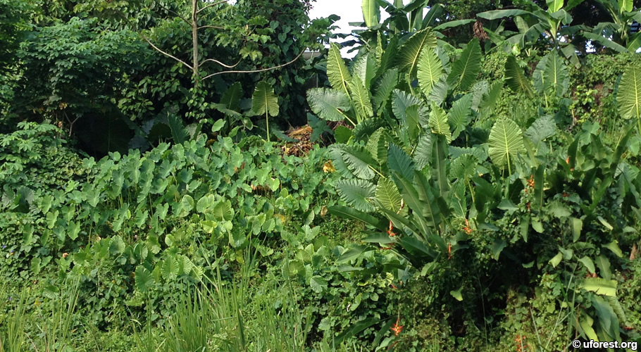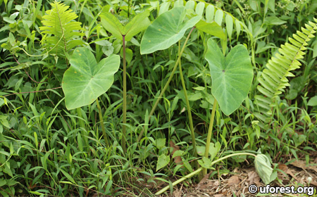 Commonly found in open secondary forests and waterlogged areas, Colocasia esculenta is a herb with large arrow-shaped smoky-green leaves with its arrow-tip pointing downwards. The petiole is sometimes tinted with purple, and it does not touch the V-shaped leaf base.
