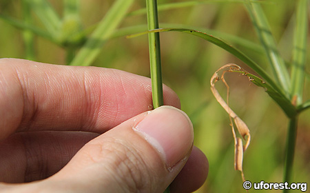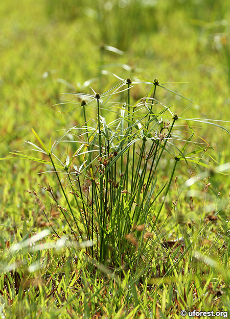 Very common in unmanaged lawns and scrublands, Kyllinga polyphylla is a upright herb with the distinctive leafy bracts surrounding the inflorescence spike at the tip as with all Kyllinga species.