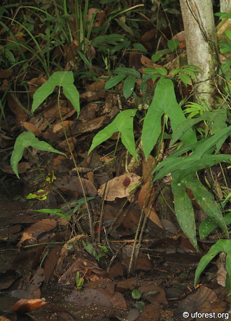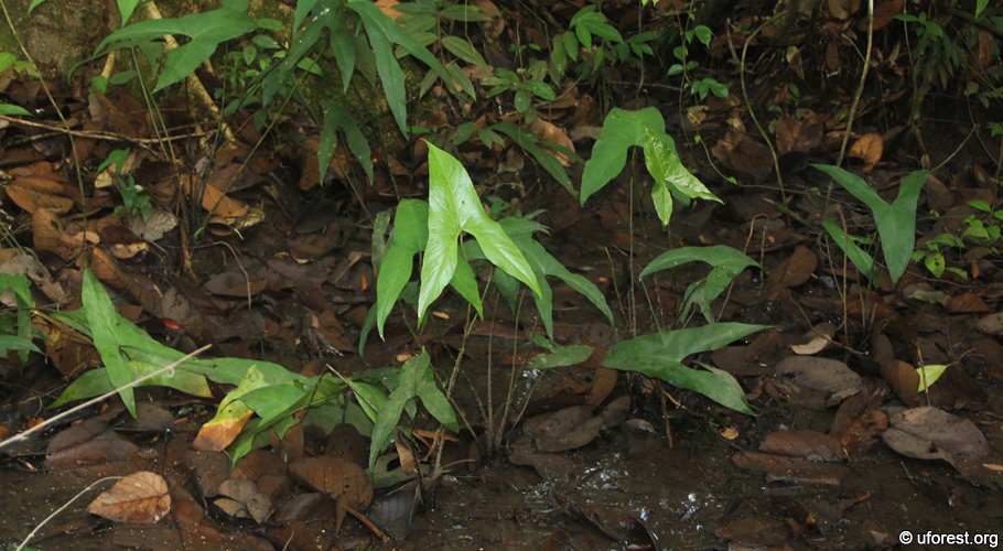 Cyrtosperma merkusii is an aroid that can be found growing near to and in pristine freshwater habitats like marshlands, streams, and swamps in the Central Catchment and Bukit Timah Nature Reserve (Lok & Tan, 2008). It is quite easy to identify it from the arrow-head leaves and prickly leaf stalks. It grows to about 1m tall.