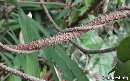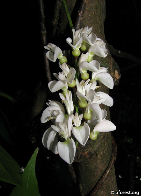 Derris trifoliata is a common woody climber found usually at the landward side of mangroves. It has imparipinnate compound leaves, with 3 to 7 leaflets, each being elliptic or ovate. The twining stems are often covered with lenticels.