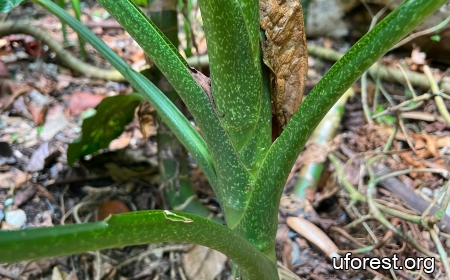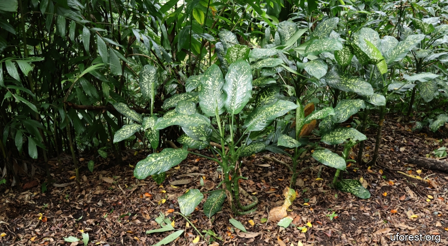 Dieffenbachia seguine is a common ornamental plant because of its varigated leaves. It is also a common sight in secondary forests which are ex-kampungs. It is a short stout herb where the stem often run horizontally along the ground before growing upright. The petioles overlap each other before extending as broad large varigated leaves.