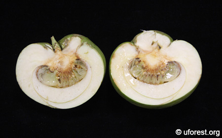 Sliced fruit. Note the overlapping sepals in white and the flesh at the centre.