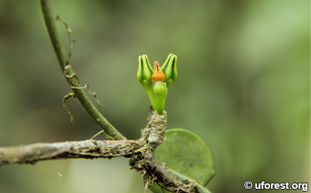 A climber that can be found in inland rainforests, coastal regions and mangroves, Dischidia major can be easily identified from its two forms of fleshy leaves. The first the normal one, are circular with a small drip-tip; while the other is a enlarged, elongated and somewhat tongue-like.