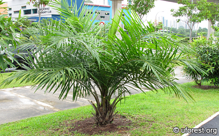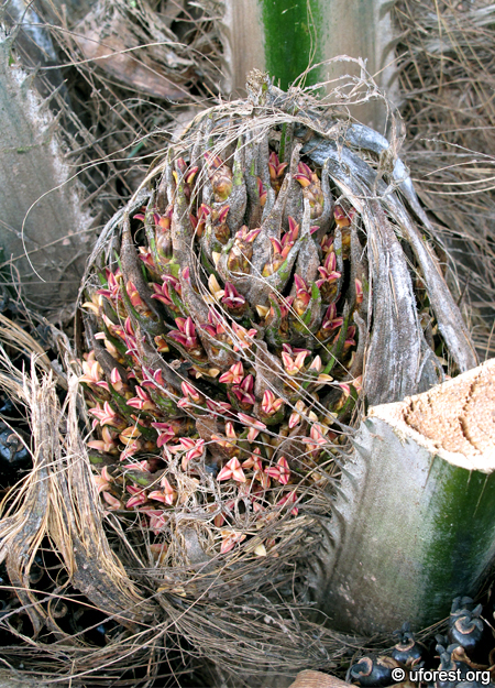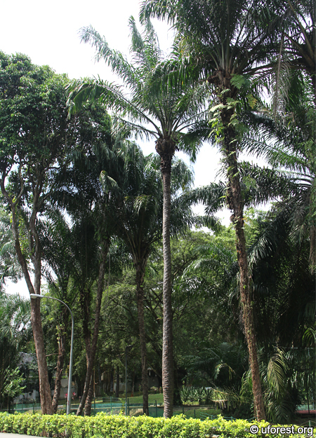 Elaeis guineensis is a common palm found in abandoned planatations here. They can either be single-stem or stemless. Cultivated ones have their leaves pruned but their petioles will still persist on the trunk, while old wild ones have a clean stem, somewhat resembling a coconut. However, the leaves have short, sharp spines on the petiole. The leaflets are dark green and rather droopy and messy in appearance.The male and female inflorescences are distinctively different; the former being tubular, and the latter being a nest of tiny flowers.