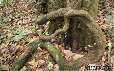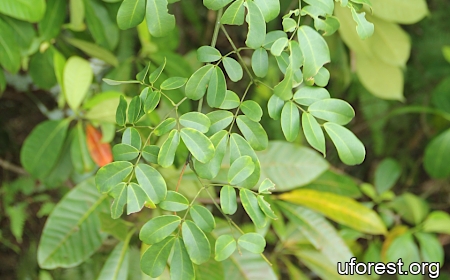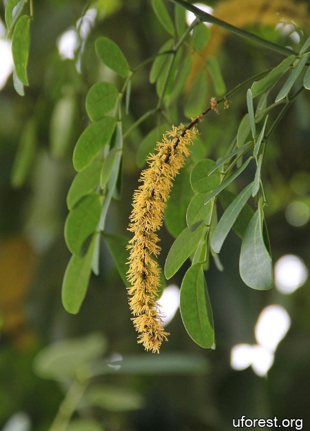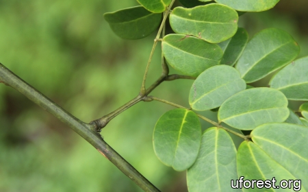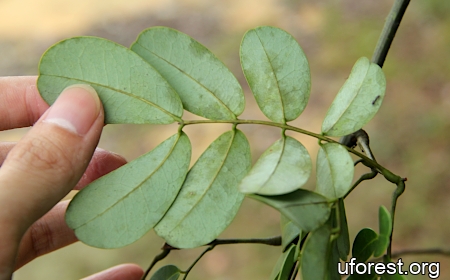 A woody climber found in our rainforest nature reserves, Entada spiralis has bipinnate compound leaves, divided into four stalks of secondary leaflets. Each leaflet is oppositely arranged and asymmetric, with a notched tip. The fruit pod is large and spiralling, and over 1m when stretched.