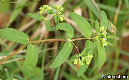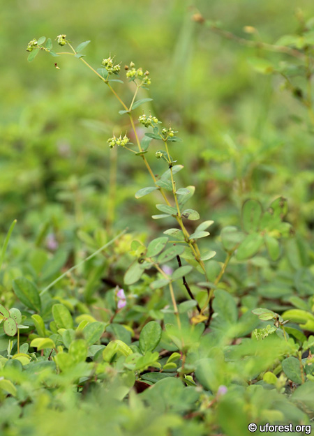 Euphorbia hypericifolia is a common herb in scrublands. The oppositely arranged leaves are usually slightly curved and have small serrations along the margins. The inflorescence consists of white petal-like glands which surrounds the male and female flowers.