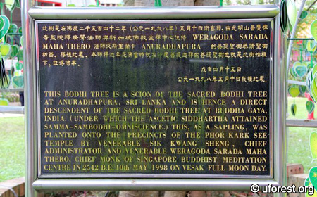 Sign under the Bodhi Tree planted in Kong Meng San Monastery.