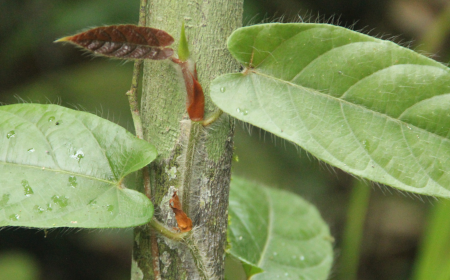 Young red leaf. Note the hairs covering all parts of the plant, and the brown stipules.