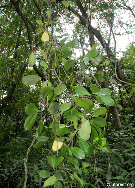 Finlaysonia obovata is found exclusively in mangroves. The leaves are oppositely arranged, normally obovate (sometimes elliptic) in shape, with distinct secondary and tertiary veins on the underside, as well as having reddish petioles (though not always). White sap is produced after breaking the leaves, a feature typical of the family.