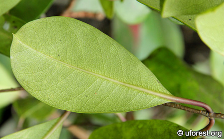 Obovate leaves, with distinct secondary and tertiary veins, and red petiole.
