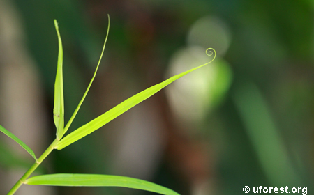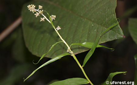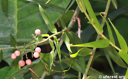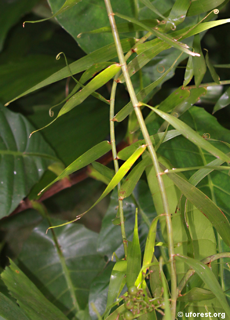 Flagellaria indica is a semi-woody forest plant that is easily recognised by its curling modified leaf tips, which form tendrils that can coil or twine tightly around other plants to enable it to climb. The stalk-less leaves are otherwise long and narrow, and resemble grass blades. When in flower, this plant has many-branched inflorescences which bear small white flowers in dense clusters. Its fruits are smooth, round, and ripen from green into a striking pink colour.