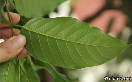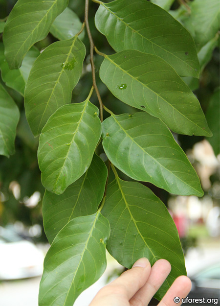 This tree has a pyramidal form with a very straight trunk. It sometimes bears drooping secondary branches. The chief diagnostic are the domatia (swollen pores) located at the lower half portion of the leaf's underside; specifically at the intersection of the primary and secondary veins (Symington, 2007).