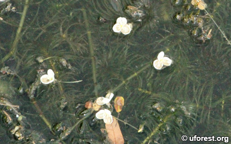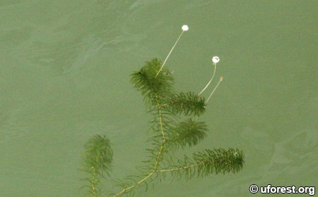 Hydrilla verticillata is a fully submerged aquatic herb. It is heavily branched with narrow serrated leaves that are arranged in whorls. Where they are found, they usually occur in dense masses. The female flowers extend via a long stalk to float on the water surface. The male flowers, on the other hand, detaches from the plant and unfold the petals on the surface, where the anthers will then dehisce explosively and release the pollen to fertilise the female flowers.