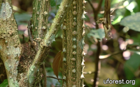 This is a critically endangered small tree or shrub that is only found in a few localities in Singapore, including Temenggong Road and Lower Seletar Reservoir (Lok et la., 2011; Yeoh & Kwok, 2016). It is most easily identifiable from its stem, which is covered with sharp prickles. Slit roots may be occasionally present, especially in mature individuals.