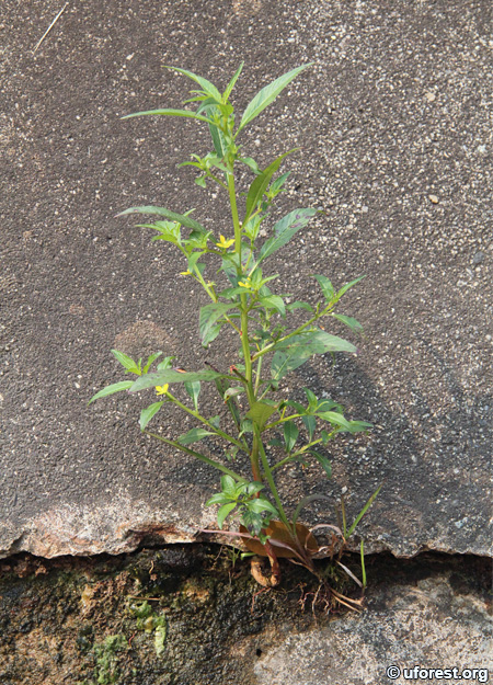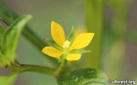 Ludwigia hyssopifolia is a herb that is usually found in waterlogged areas like within drains. The lance-shape leaves are glossy with prominent secondary veins. The yellow flowers are 4-petaled with pointed ends. It can be differentiated from another relative, Ludwigia octovalvis with the latter's petals having rounded ends, with longer and narrower leaf blades.