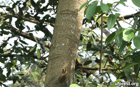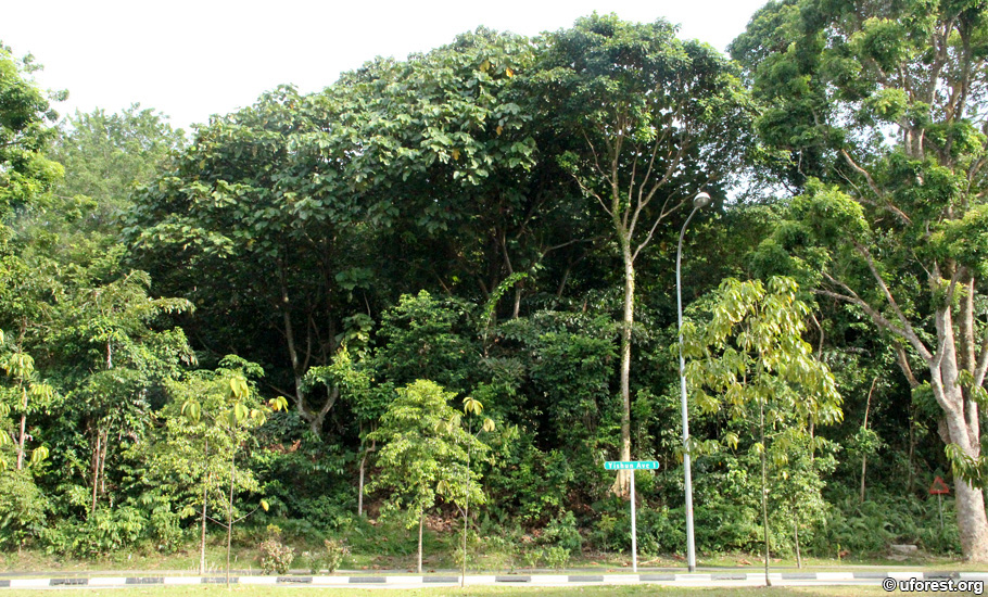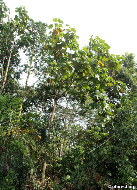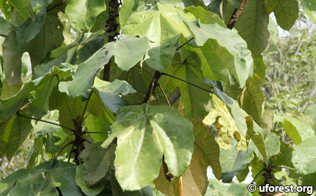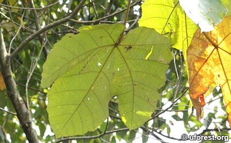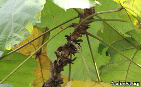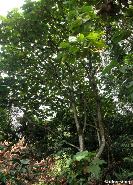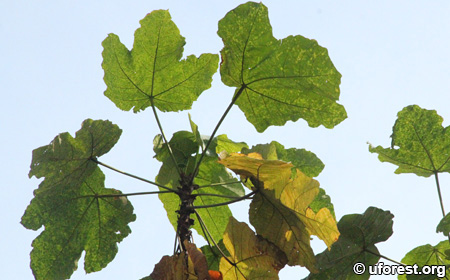 Macaranga gigantea is a common tree found in secondary forests, growing up to 18m. They have huge palmate leaves of 3-5 lobes, measuring 20-80cm long (Corner, 1997). The ends of the leafy branches are often covered with persistent large old stipules. The trunk bears prominent leaf scars.