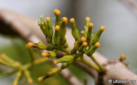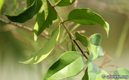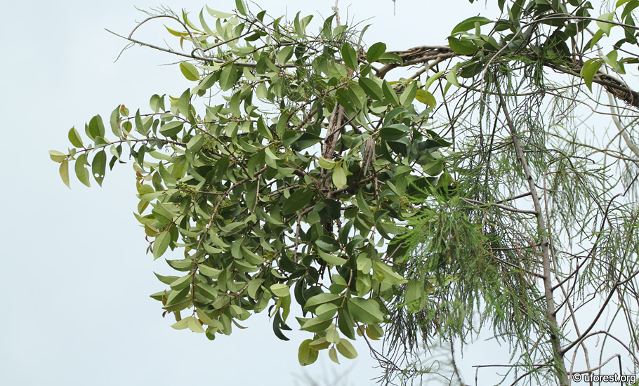 Macrosolen cochinchinensis is the second most widespread and common mistletoe in urban areas of Singapore. In contrast with other mistletoes, it has oppositely arranged leaves, and the leaves are broadly elliptic, pointed at the ends, and are bend upwards along the mid-veins. The flower buds are very distinctive with their yellow tips.