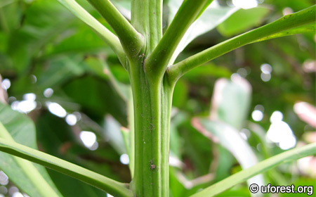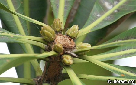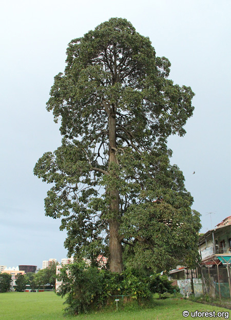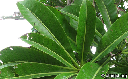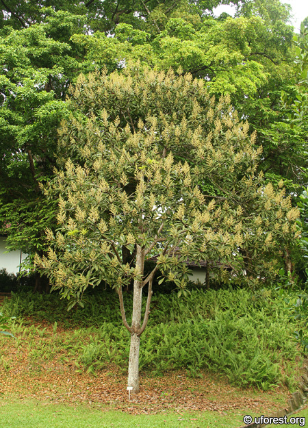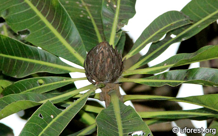 Mangifera caesia is a large tree up to 35m (Ding Hou, 1978), with near obovate leaves and a thick, raised mid vein. Not sure if this is a characteristic trait, but pine nuts-like structures are present at the terminal of the branches . Only this mango species in Malaya (which includes Singapore) have lavender coloured flowers (Corner, 1997).