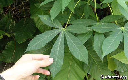 Manihot esculenta is a common shrub found in sunny areas usually along forest edges, and also frequently cultivated for the edible tubers. It has palmately compound leaves, and differs from a close relative Manihot carthagenensis subspecies glaziovii with the latter having larger leaves and broader tips at the lobes.