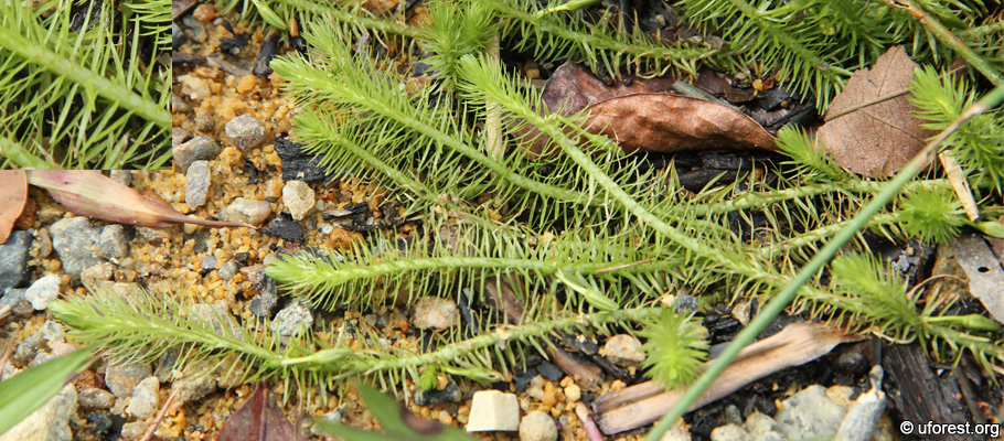 The foliage of Mayaca fluviatilis, and close-up showing the spiral arrangement.
