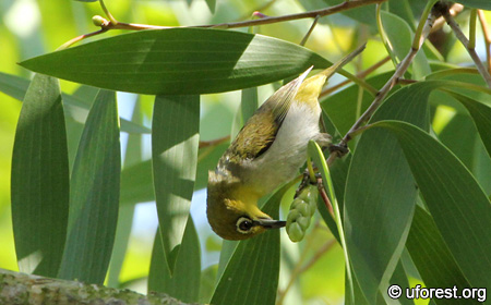 Leaf, with an Oriental White-eye sucking from a flower bud.