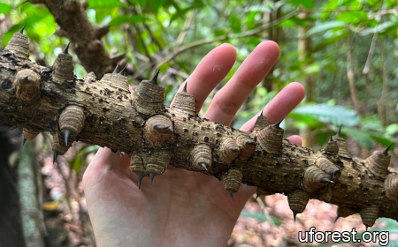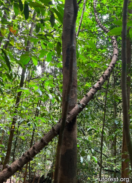 Mezoneuron sumatranum is an uncommon but very distinctive woody climber that is found in our primary rainforests, with its stem covered with large recurved thorns that are heavily thickened at the base.