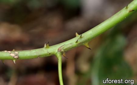 Close up of the recurved thorns on a young stem