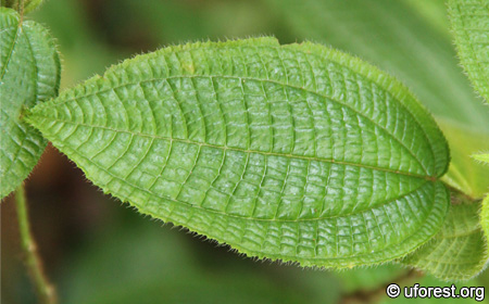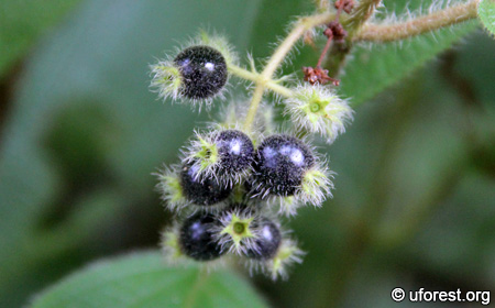 Clidemia hirta is a very common herb with a shrubby habit, and frequently found on forest edges. One thing unique about this plant is that every part of it is covered with dense hairs; from the leaves to the stems and even the fruits. The leaves are also quite recognisable, having deeply furrowed secondary and tertiery veins.
